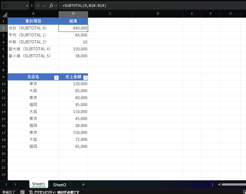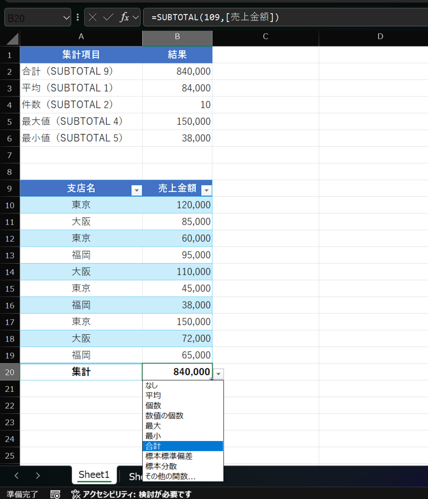Excelの「テーブル」機能(Ctrl+T)を使うと、集計行が自動でSUBTOTAL関数を使ってくれます。テーブルの集計行ドロップダウンから「合計」「平均」などを選ぶだけでOK。数式を手入力する必要がありません。