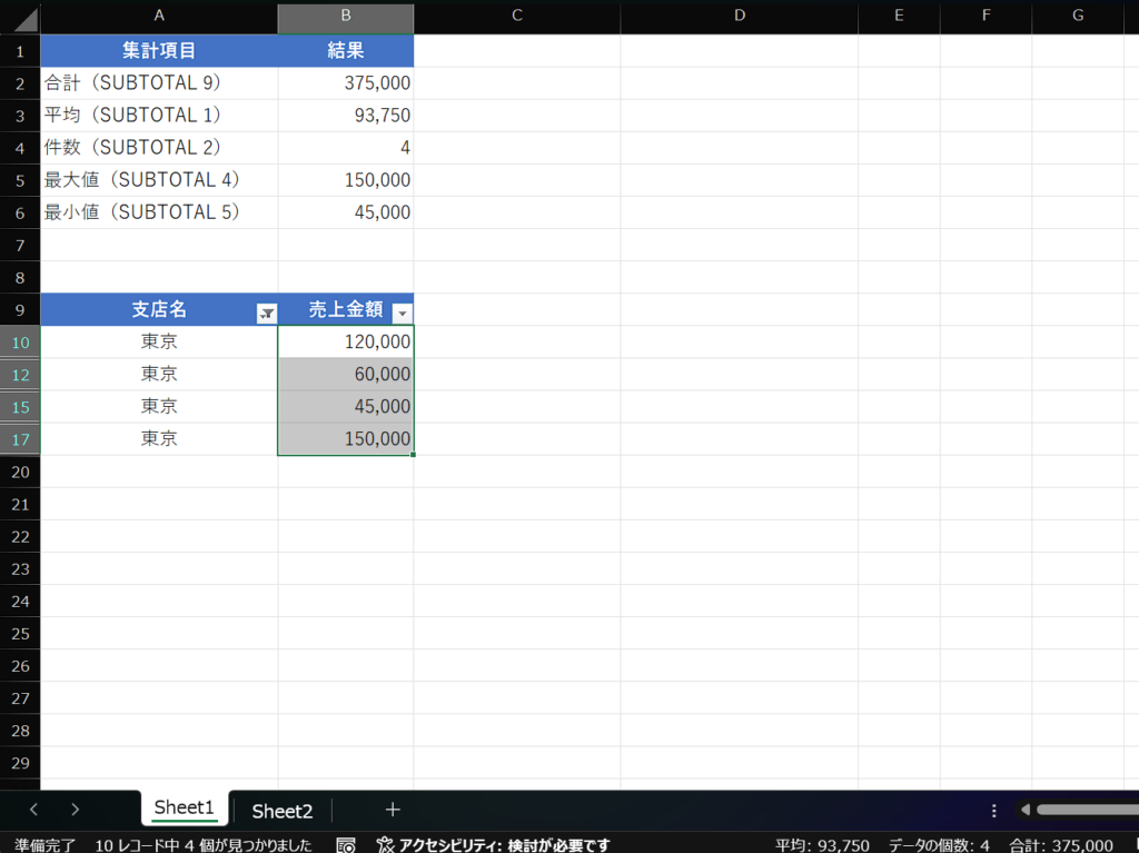 SUBTOTAL関数は、フィルターや非表示行を無視して、見えているセルだけを集計できる関数です。